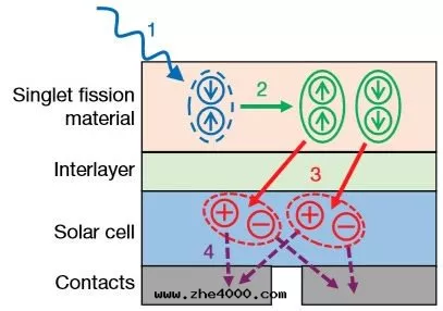 在(zài)太陽能(néng)電(diàn)池中(zhōng),光子激发材料分(fēn)子釋放(fàng)電(diàn)子,产生(shēng)電(diàn)流。通(tòng)常一(yī)个(gè)光子只(zhī)能(néng)激发出(chū)一(yī)个(gè)電(diàn)子,高(gāo)能(néng)光子的(de)剩餘能(néng)量(liàng)会(huì)以(yǐ)热(rè)量(liàng)的(de)形式散(sàn)失。