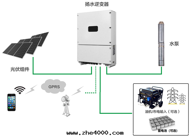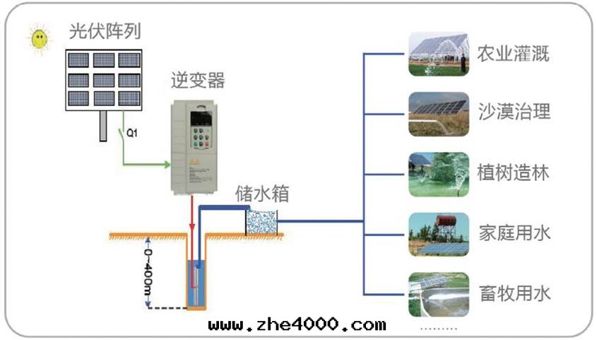 光伏揚水(shuǐ)系(xì)統广泛應(yìng)用(yòng)于(yú)无電(diàn)网、電(diàn)网不(bù)发达(dá)的(de)國(guó)家(jiā)及(jí)區(qū)域,通(tòng)过(guò)使用(yòng)光伏組件(jiàn)将綠(lǜ)色(sè)能(néng)源太陽能(néng)轉(zhuǎn)化(huà)为(wèi)直(zhí)流電(diàn),經(jīng)揚水(shuǐ)逆變(biàn)器轉(zhuǎn)换輸出(chū)交流電(diàn)来(lái)驅動(dòng)水(shuǐ)泵電(diàn)動(dòng)機(jī)抽水(shuǐ),将低(dī)水(shuǐ)位(wèi)的(de)水(shuǐ)源提(tí)升(shēng)到(dào)到(dào)高(gāo)水(shuǐ)位(wèi)的(de)蓄水(shuǐ)池或水(shuǐ)渠、管(guǎn)道(dào),實(shí)現(xiàn)自(zì)動(dòng)化(huà)的(de)取(qǔ)水(shuǐ)用(yòng)途。